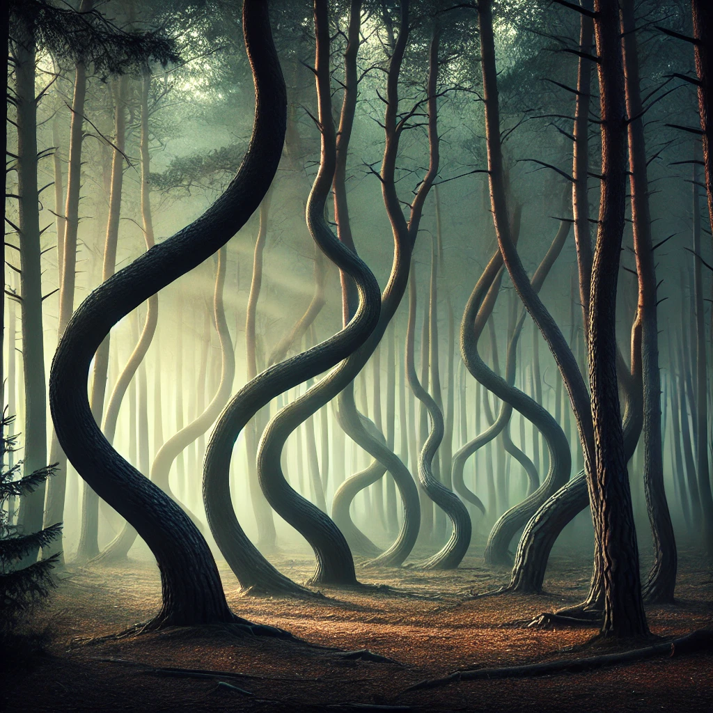 # 폴란드의 비뚤어진 목재 답을 기다리는 자연스러운 수수께끼: 독특한 곡선형 줄기를 가진 나무들이 우거진 숲으로, 그들의 기이한 성장 패턴에 대한 명확한 설명은 없습니다.