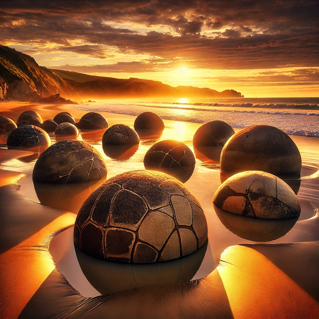 # 모에라키 볼더스 뉴질랜드의 신비로운 해안 천재들: 완벽하게 둥근 바위들이 해변을 따라 흩어져 있으며, 마오리 전설이 그 형성을 설명하고 있습니다.