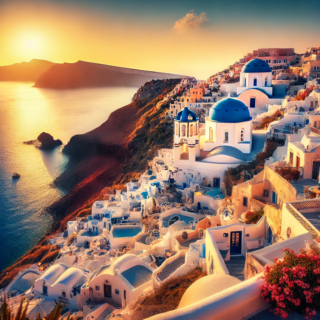 하얀 건물들, 푸른 돔 교회들, 그리고 에게해의 전설적인 일몰로 유명한 꿈의 섬.